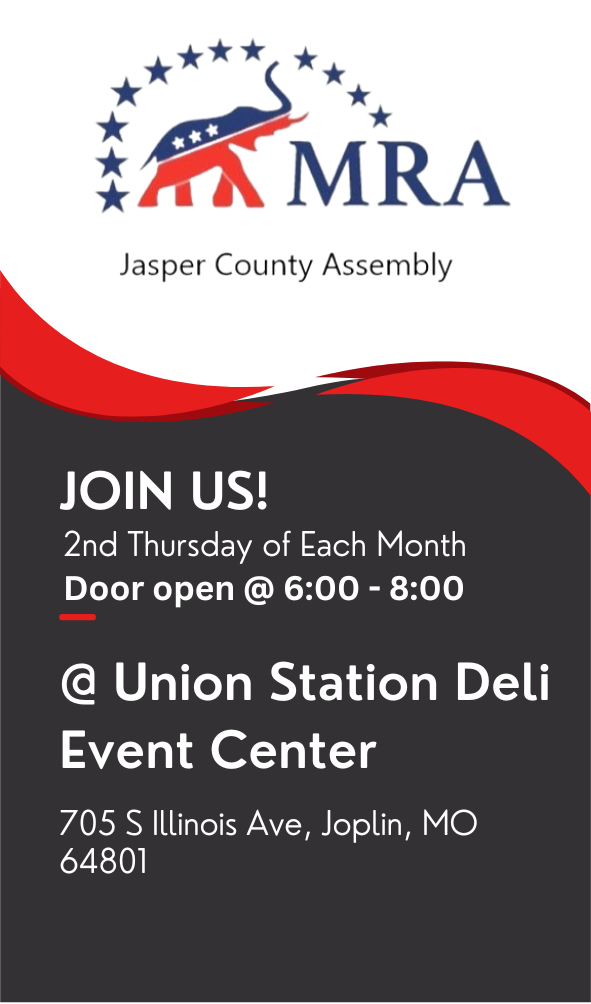 At the Jasper County Missouri Republican Assembly (JCMRA), we're dedicated to fostering a community of conservatives who passionately advocate for freedom, limited government, and traditional values. Rooted in the rich history and vibrant spirit of Jasper County, our assembly is a beacon for those who believe in the power of grassroots activism to shape our nation's future. We champion policies that uphold the Constitution, empower individuals, and promote the well-being of our local communities. Join us as we work towards a brighter, more prosperous America, starting right here in Jasper County.
